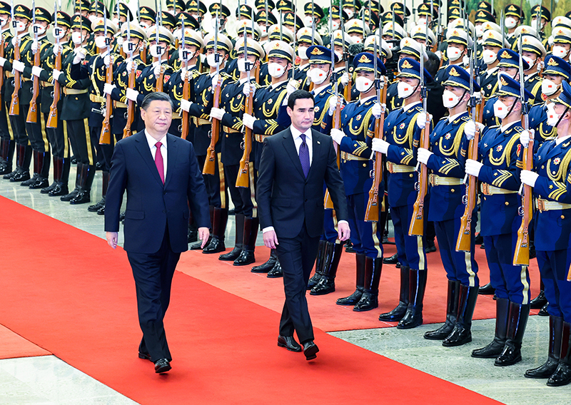 会谈前,习近平在人民大会堂北大厅为谢尔达尔・别尔德穆哈梅多夫举行欢迎仪式。